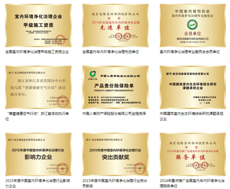 品牌不僅被央視納為宣傳推薦品牌,更是在2012年獲得了中國室內(nèi)環(huán)保凈化產(chǎn)品十佳品牌,同時,創(chuàng)綠家被評為中國中輕質(zhì)量信譽雙保證重點推薦單位,室內(nèi)環(huán)境檢驗治理達標(biāo)單位,并擁有室內(nèi)環(huán)境污染治理證書,被評為全國環(huán)保行業(yè)質(zhì)量放心、消費者***品牌!