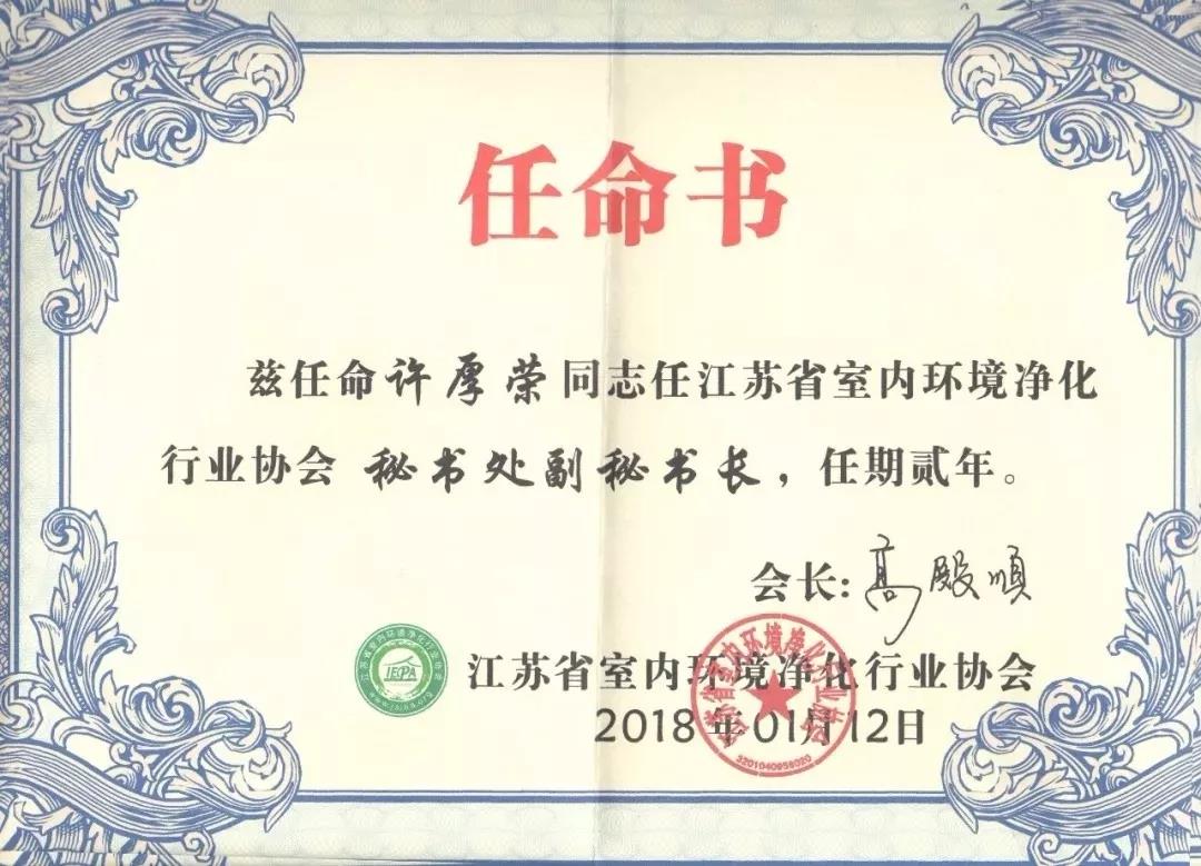 2018年1月13日,“中國室內環(huán)境凈化行業(yè)協(xié)會聯(lián)盟”與“江蘇省室內環(huán)境凈化行業(yè)協(xié)會”聯(lián)合舉辦的首屆“中國室內環(huán)保行業(yè)創(chuàng)新創(chuàng)優(yōu)、融合發(fā)展”高峰技術年會在中國南京召開。協(xié)會隆重表彰了2017年度行業(yè)“突出貢獻獎”——許厚榮,任命其為江蘇省室內環(huán)境凈化行業(yè)協(xié)會秘書處副秘書長。