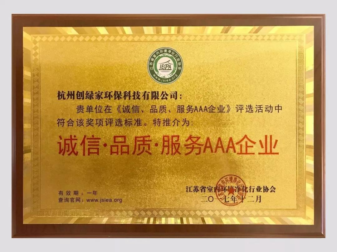2018年1月13日,“中國室內環(huán)境凈化行業(yè)協(xié)會聯(lián)盟”與“江蘇省室內環(huán)境凈化行業(yè)協(xié)會”聯(lián)合舉辦的首屆“中國室內環(huán)保行業(yè)創(chuàng)新創(chuàng)優(yōu)、融合發(fā)展”高峰技術年會在中國南京召開,我司榮獲誠信加盟服務單位、“誠信、品質、服務”AAA企業(yè)、示范工程獎、科技創(chuàng)新產品獎等多項榮譽。