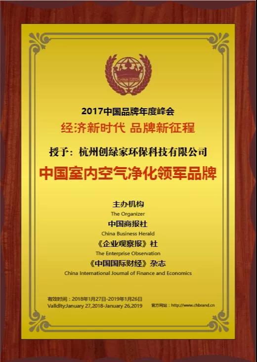 2018年1月26日-28日,由中國商報社、《企業(yè)觀察報》社和《中國國際財經(jīng)》雜志聯(lián)合主辦的“2017中國品牌年度峰會”在京隆重舉行。杭州創(chuàng)綠家環(huán)??萍加邢薰緲s獲“中國室內空氣凈化領軍品牌”殊榮。