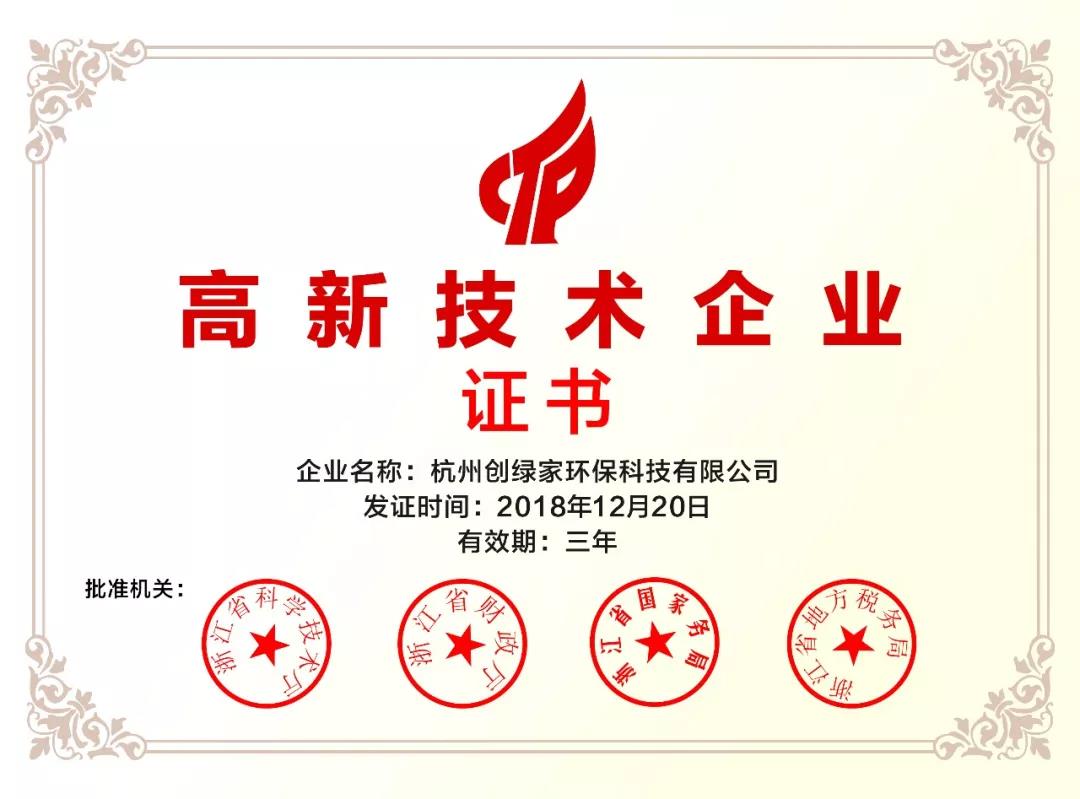 2018年12月,杭州創(chuàng)綠家環(huán)保科技有限公司被認定為國家高新技術企業(yè)。