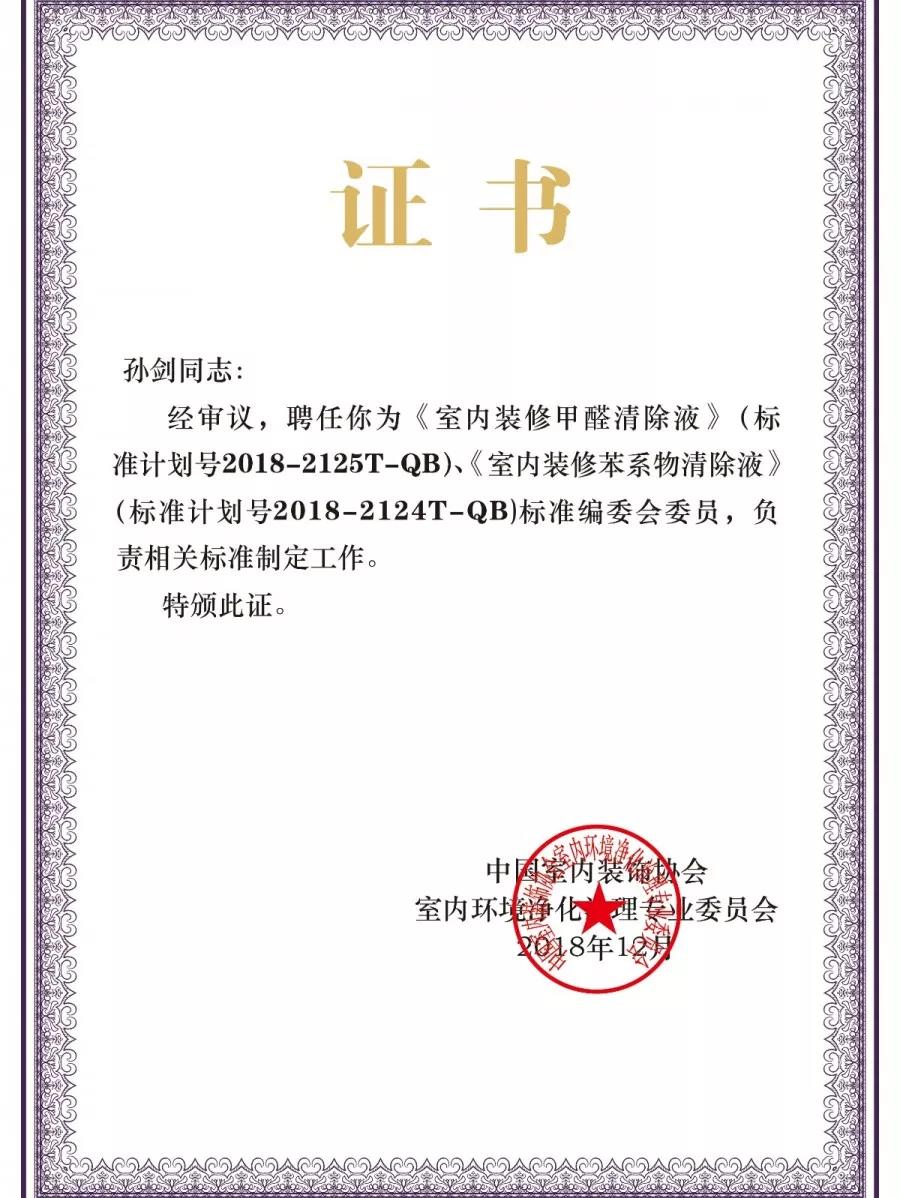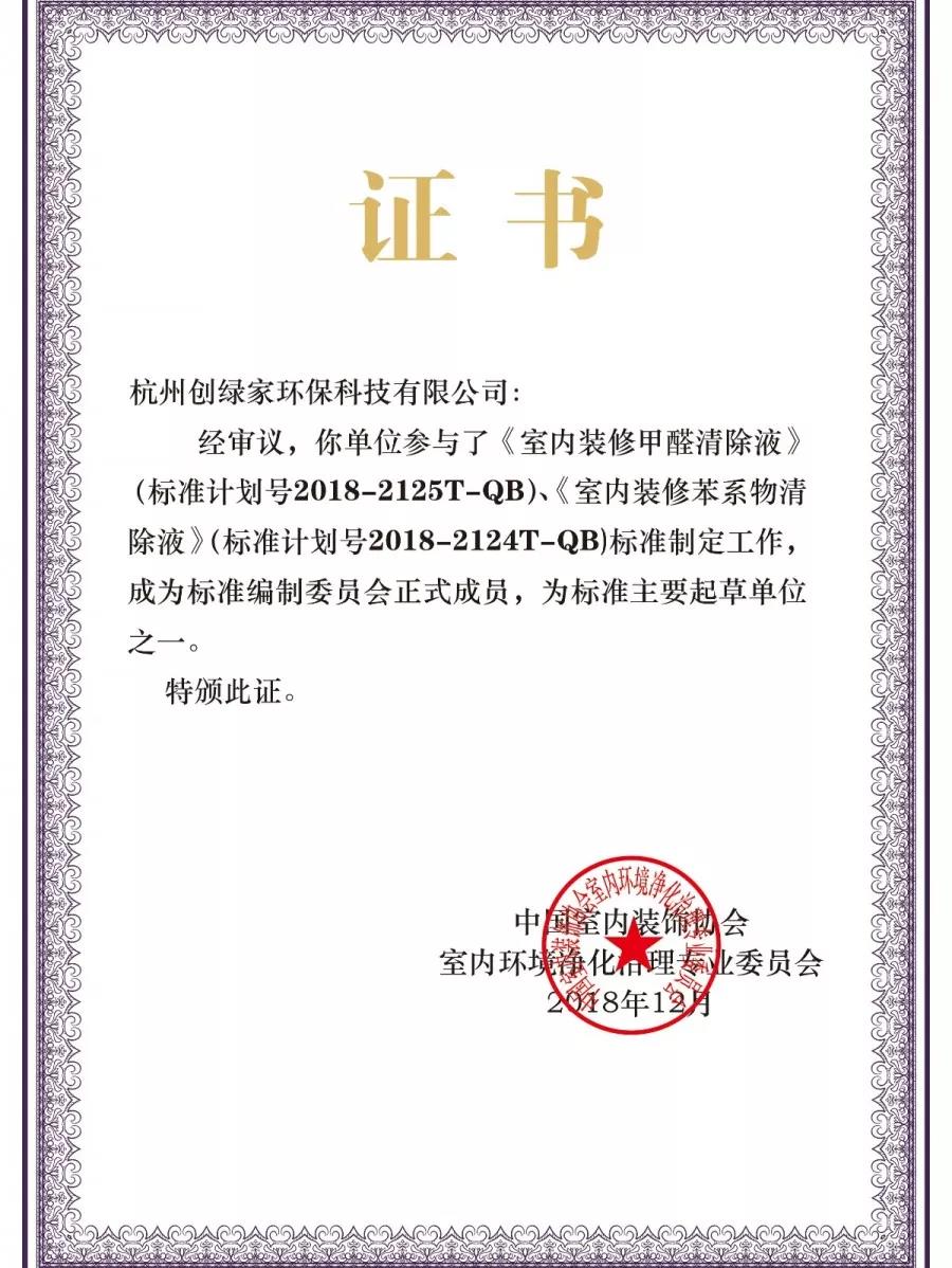 2018年12月19日,中國室內環(huán)境凈化治理行業(yè)第五屆技術創(chuàng)新分享會在北京新聞大廈長安發(fā)布廳舉行。創(chuàng)綠家環(huán)保成為《室內裝修甲醛清除液》、《室內裝修苯系物清除液》標準內編制委員會正式成員,為標準主要起草單位之一,創(chuàng)綠家環(huán)??偛脤O劍被聘任為該標準編委會委員。